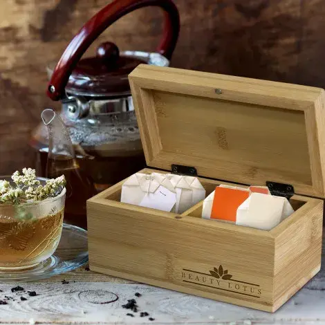 Useful tea storage box made from natural bamboo with two compartments and a hinged lid featuring a magnetic closure. The tea box is presented in natural kraft gift box with NATURA branding and is ideal for hospitality and gifting.