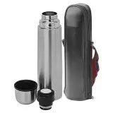750ml BPA free vacuum insulated double wall stainless steel flask it has a screw on stainless steel lid and push button operation keeps hot for 12 hours and cold for 24 hours brushed silver steel colour and laser engrave to a natural silver etch comes with a PVC case which has a zip closure and carry belt. This flask is not dishwasher safe handwashing is recommended.