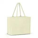 Extra-wide laminated jute tote bag with a large gusset and padded cotton handles. The bag and handles have been dyed to match.