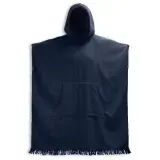 Convenient hooded towel made of 320gsm, 100% cotton. With a fringe trim and kangaroo pocket, this towel is both absorbent and stylish. It has side snaps, terry on the inside, and a flat weave on the outside.