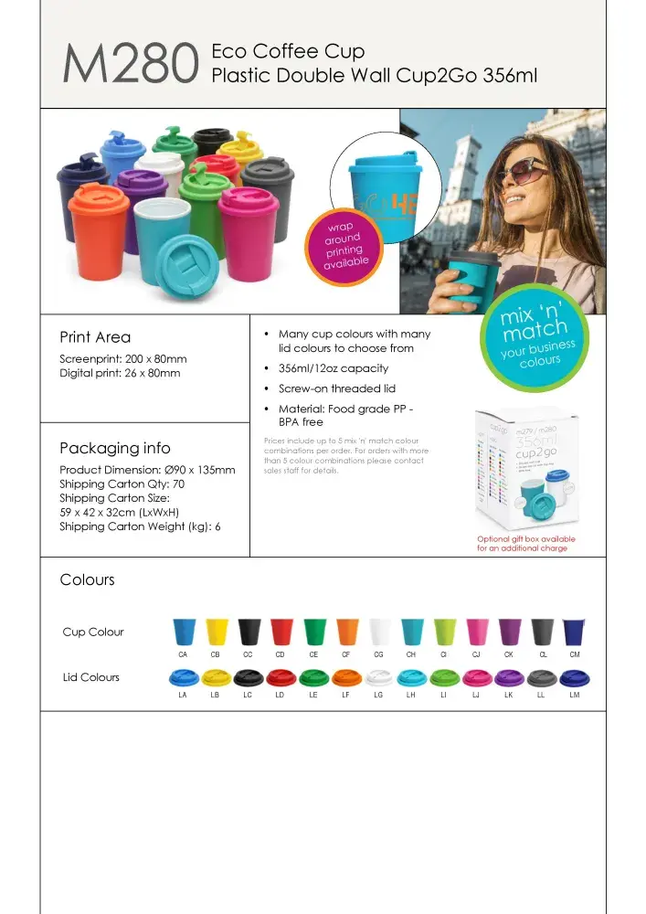 Demonstrate an eco-conscious outlook with this 356ml double-walled Cup 2 Go. Double-walled to keep beverages at their desired temperature. Available with many coloured cup finishes, that can be screen or digitally printed on, and a variety of different colored lids through which to further express yourself. Not microwave or dishwasher safe. Optional Gift box available for an additional charge.