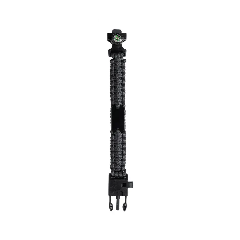 Durable nylon paracord construction for strength and reliability. | Integrated compass for easy navigation. | Built-in whistle for emergency signaling. | Flint fire starter for quick fire making in the wild. | Lightweight and compact, ideal for hiking, camping, or survival kits. | Adjustable design for a comfortable fit.