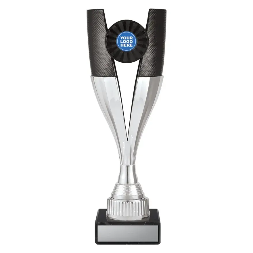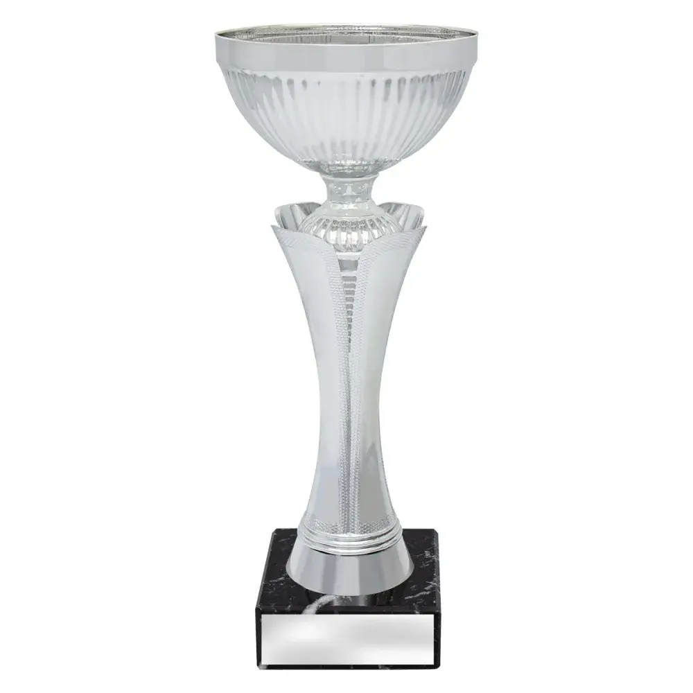 Stylish presentation cups with classic silver finish with metal bowl and prestige marble base elements.