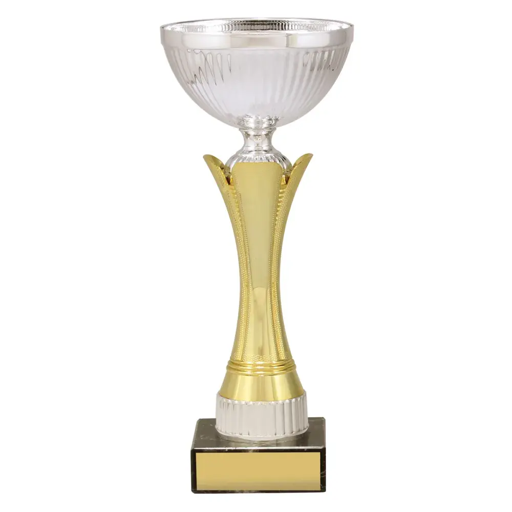 Elegant design for series of cups that feature brilliant metal bowls and classic marble bases. Available in 5 sizes - trophy cups also feature striking gold and silver colour combination.