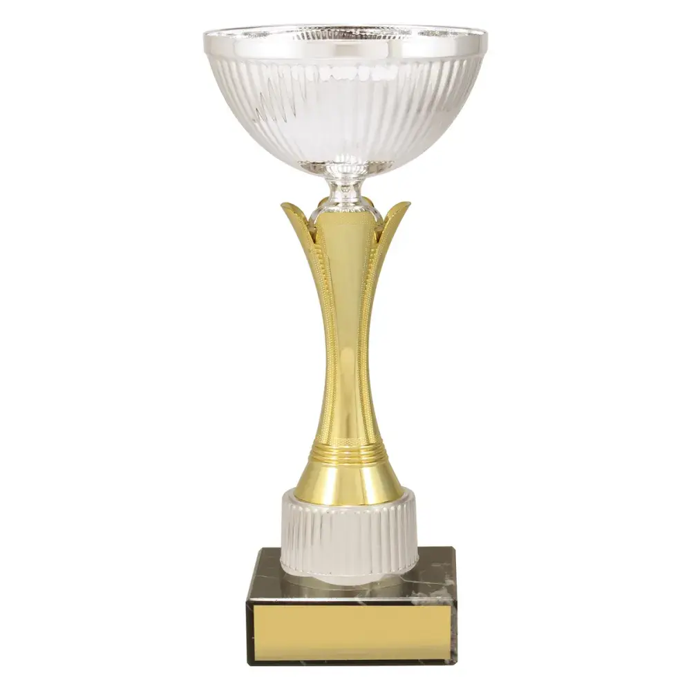 Elegant design for series of cups that feature brilliant metal bowls and classic marble bases. Available in 5 sizes - trophy cups also feature striking gold and silver colour combination.