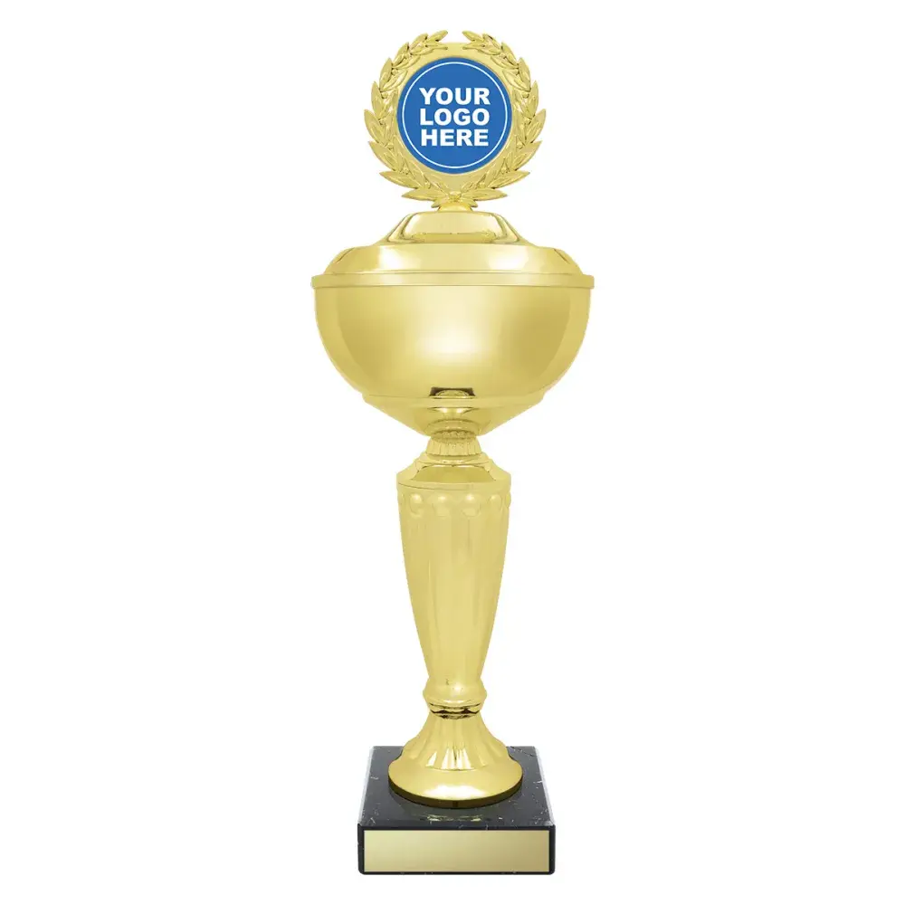 Elegant & classic line of trophy gold cups with prestige black marble. Cups completed by the traditional logo holder to show your custom design. Available in different sizes.