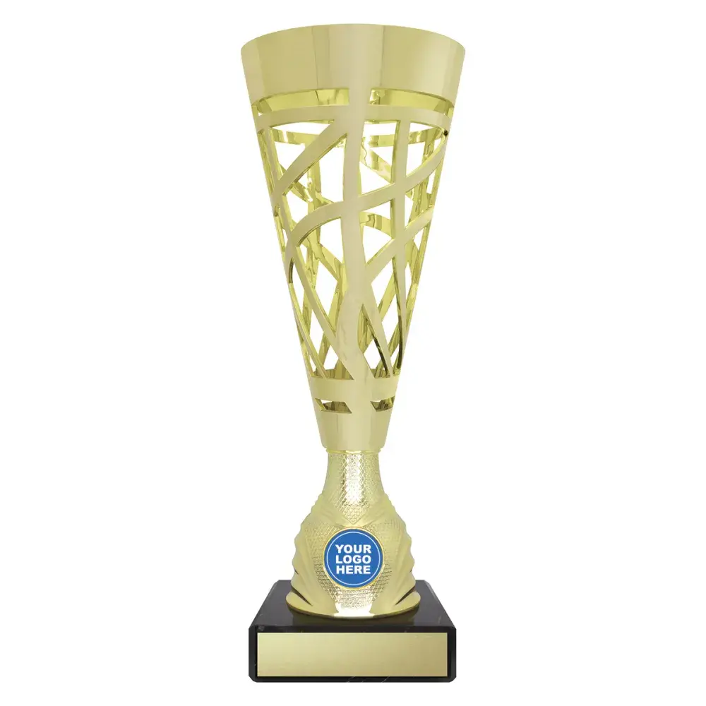 Super interesting design of trophy with swirling design plus great space for your custom insert. The Serafino trophies are available in gold or silver.