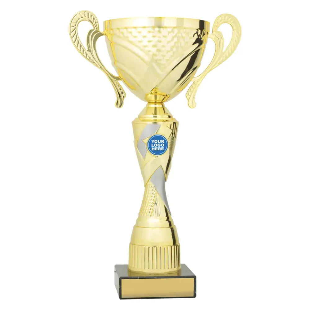 The Gold & Silver 'Trident' series of cups present stylish trophies in 5 different sizes with prominent space for your 25mm centre insert. Consider your custom option or choose from generic range on offer. Gold metal bowls - with handles - and classic, heavy marble bases.