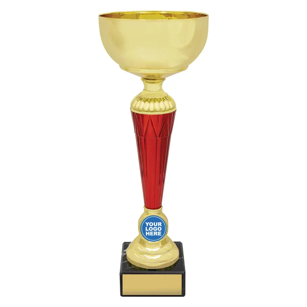 Appealing trophy cups feature red columns with space for your custom logo - over number of sizes providing options for you awards.