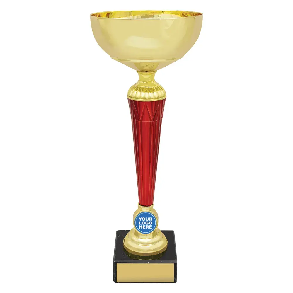 Appealing trophy cups feature red columns with space for your custom logo - over number of sizes providing options for you awards.