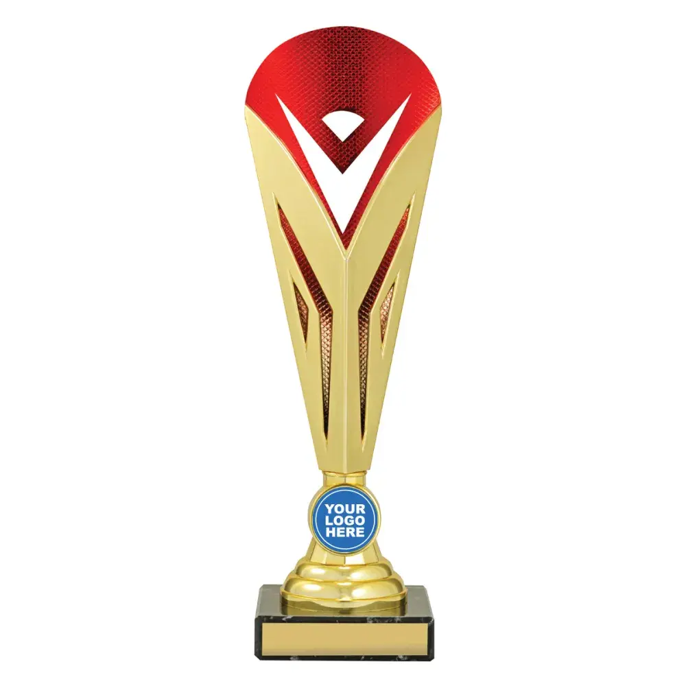 Brilliant Red & Gold trophies with innovative cup design perfect for your special award winners. Cups available in 3 great sizes and feature modern design and different textures. Black marble bases provide extra prestige.