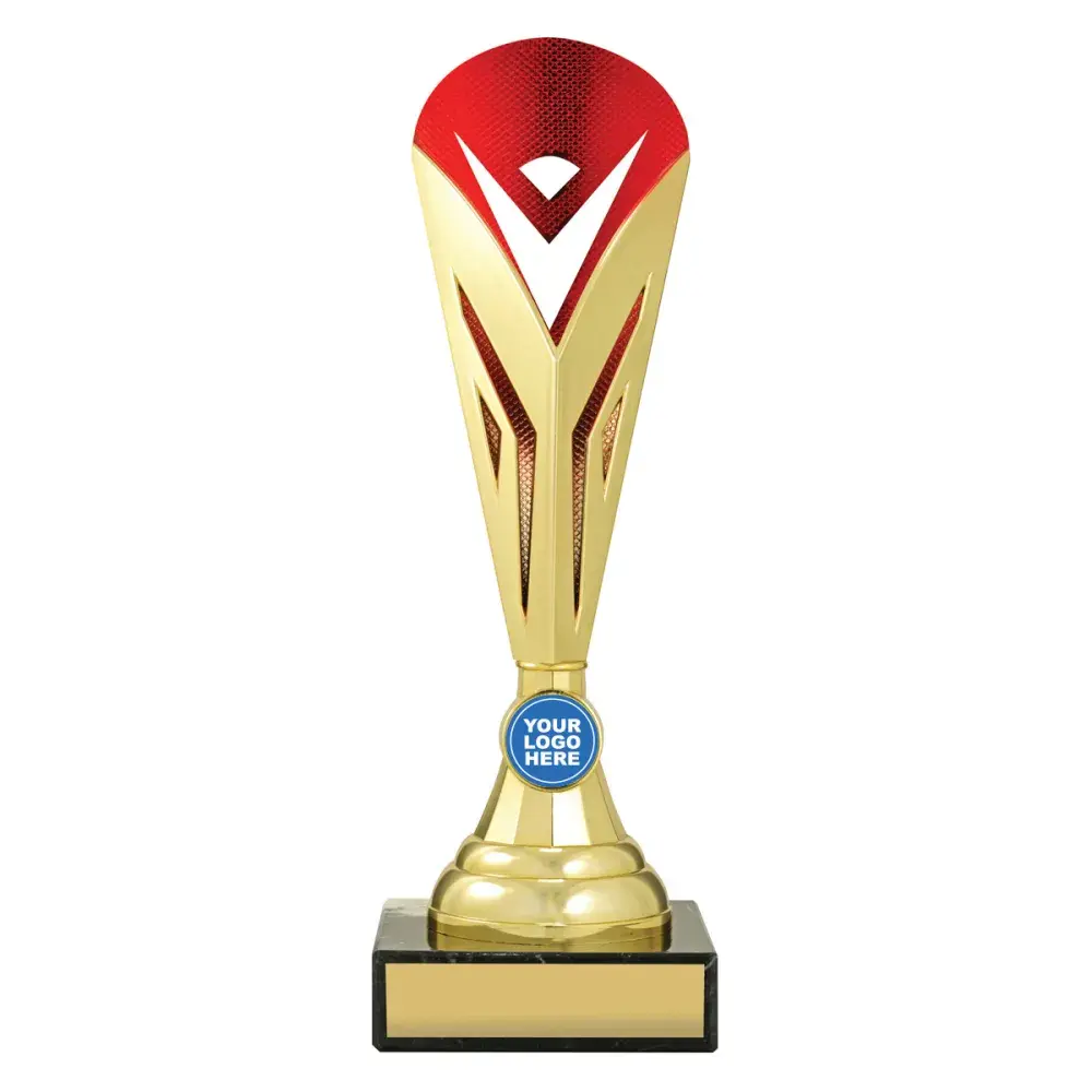 Brilliant Red & Gold trophies with innovative cup design perfect for your special award winners. Cups available in 3 great sizes and feature modern design and different textures. Black marble bases provide extra prestige.