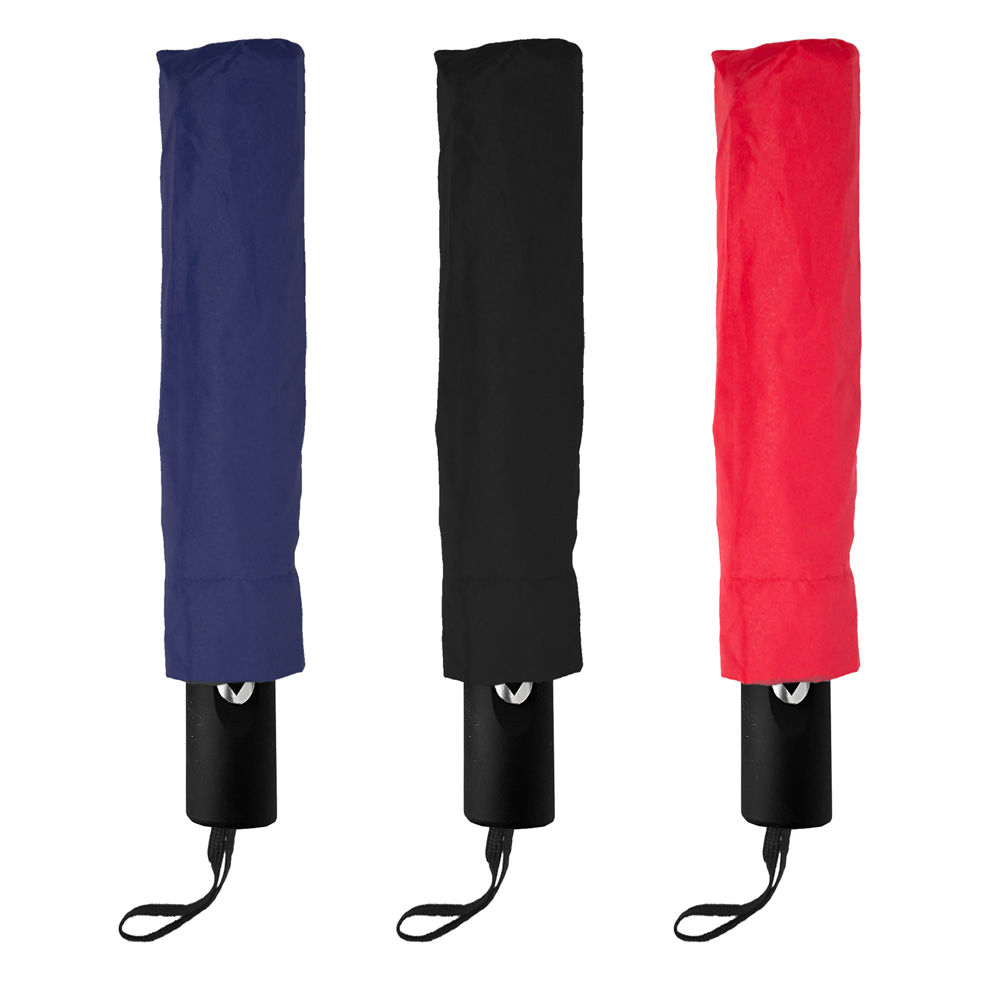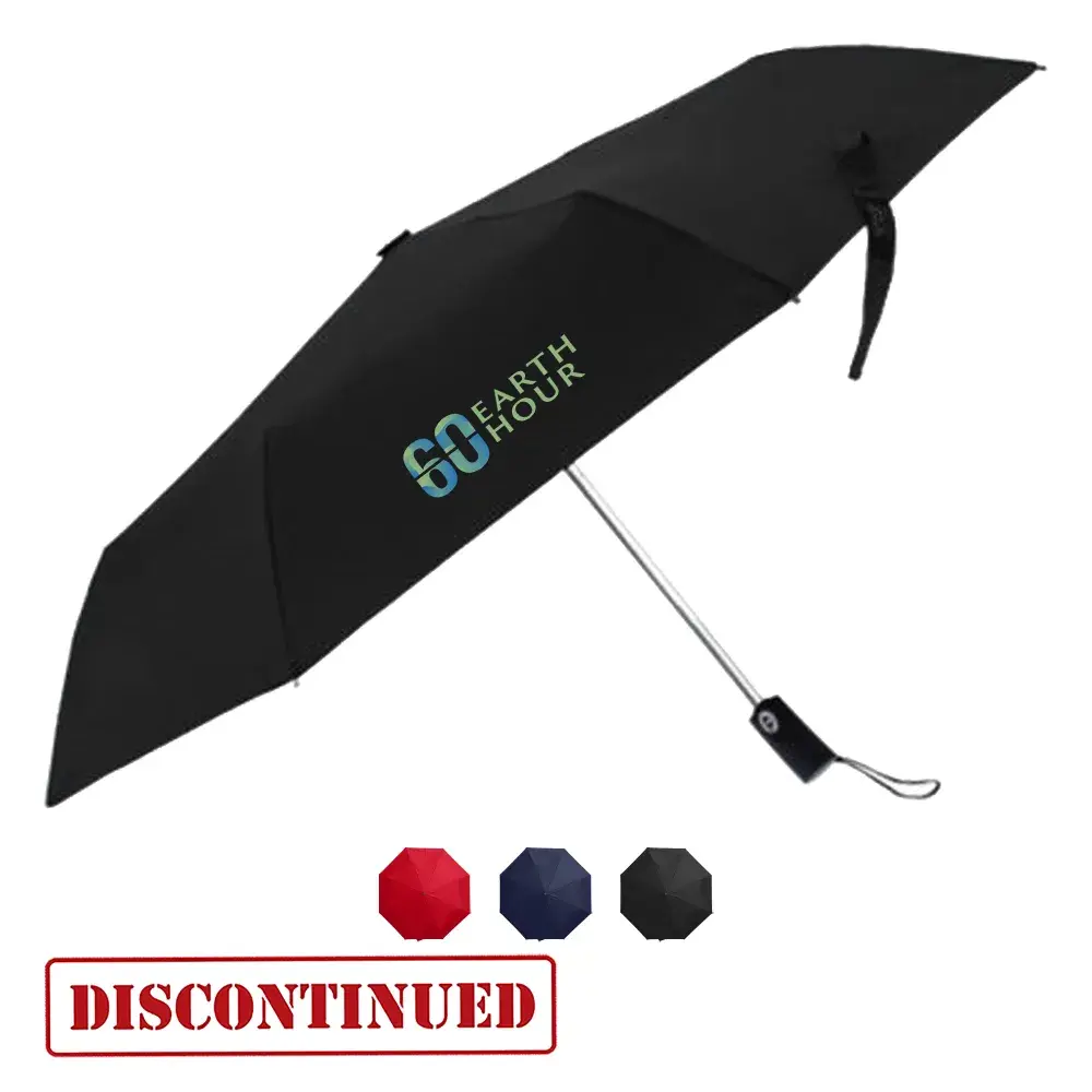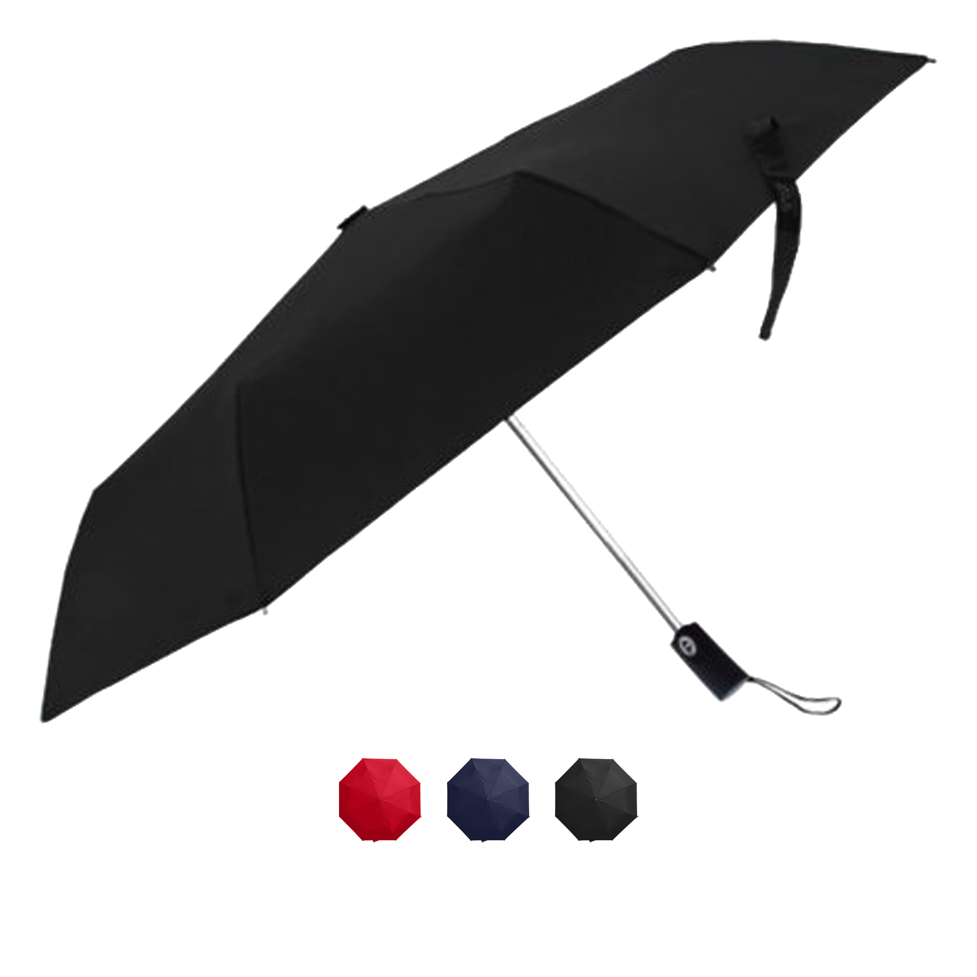 High quality foldable showerproof umbrella with eight-panel 190T pongee canopy and a velcro tie compact umbrella with auto opening and closing function which makes it easy to use and carry it has a stop and hold safety feature quality two-stage telescopic stainless steel shaft and 53.5cm nylon ribs comfortable black soft-touch rubberized plastic handle with a wrist strap attached. It is packed in a matching pongee sleeve and silver aluminium canister.