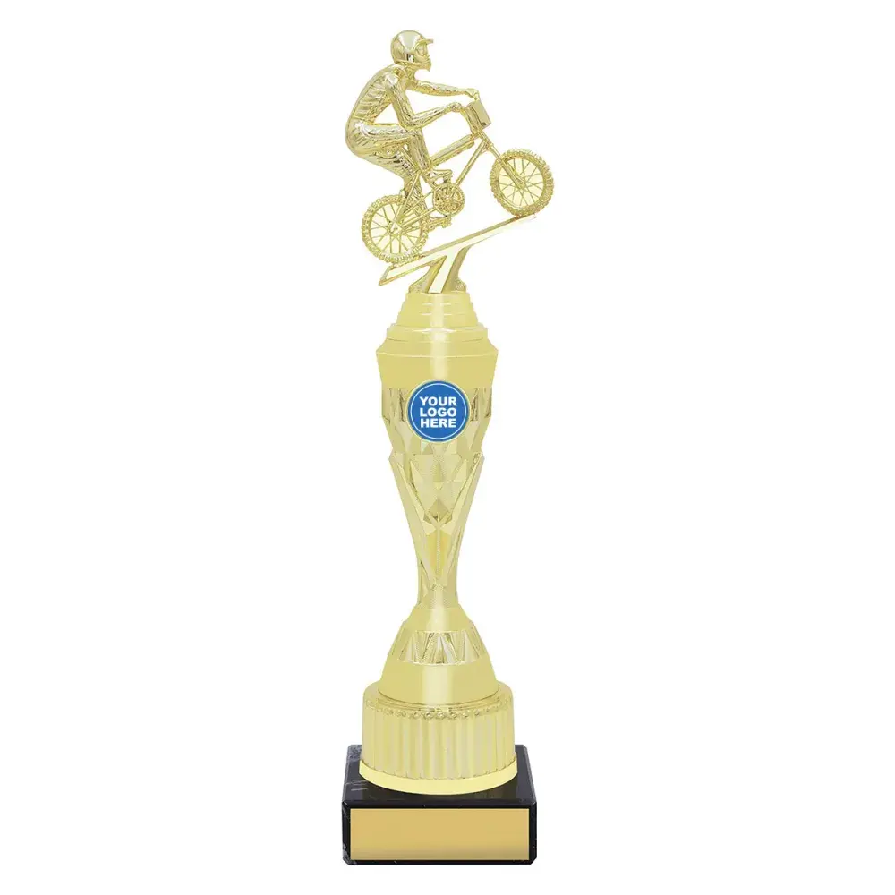 Series of riser style trophies hold the figure or top for your sport and give you the opportunity to promote your club or event with space for a custom insert.