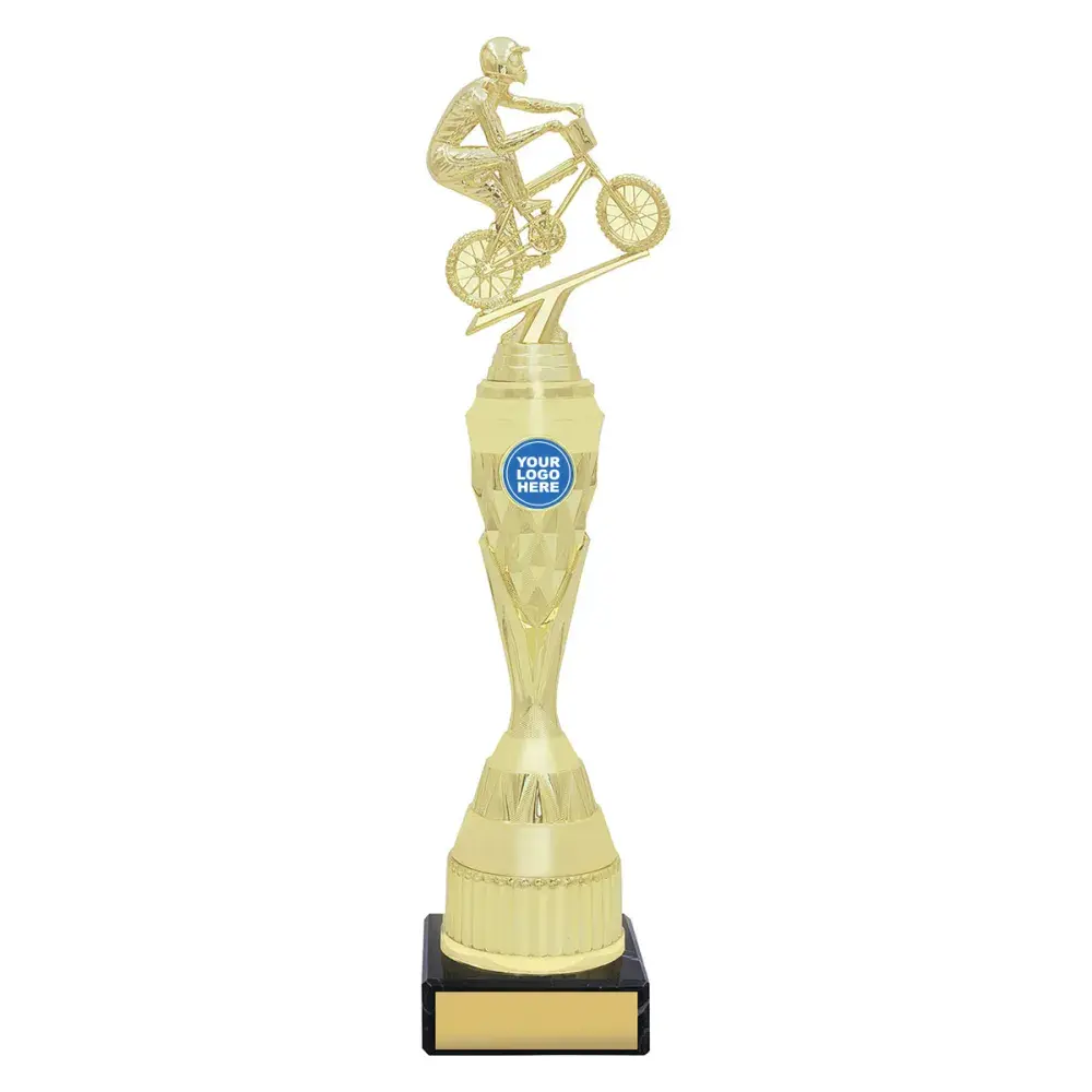 Series of riser style trophies hold the figure or top for your sport and give you the opportunity to promote your club or event with space for a custom insert.