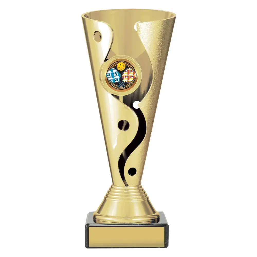Carnival cups present a distinctive cup style trophy with attractive 3D design - on classic black marble base for your engraving - with brightly coloured insert for your sport. Trophies adaptable to your custom requirements.