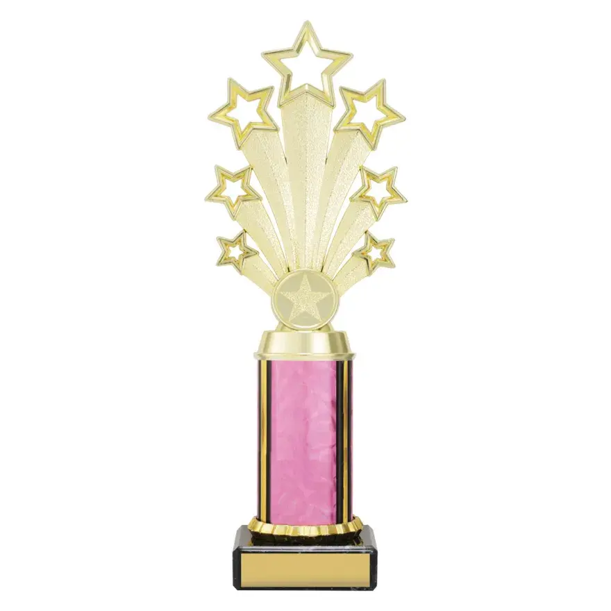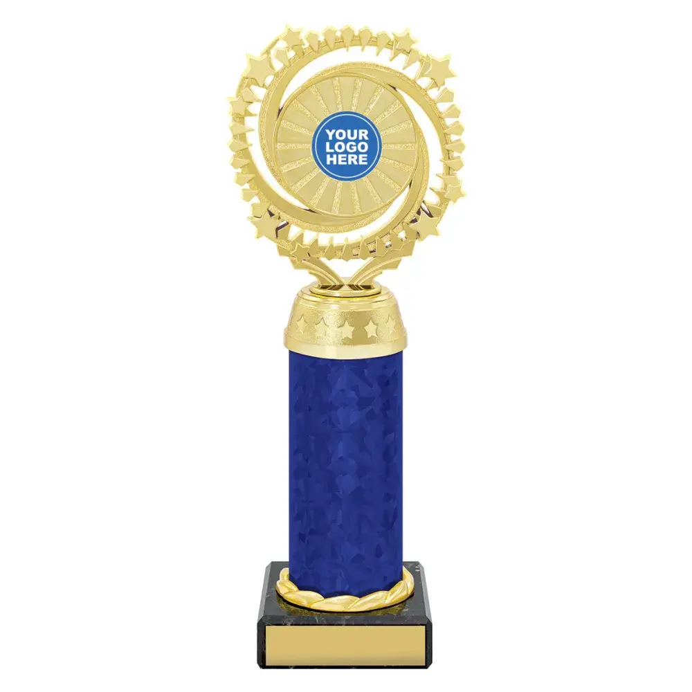 Cosmic series of affordable trophies feature star spangled holder in gold or silver - choose colour of column to suit your order. Suit 25 or 50mm centre insert.