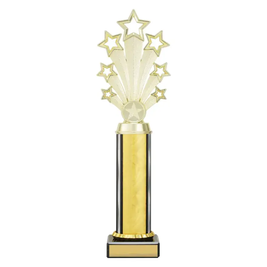 Cosmic series of affordable trophies feature star spangled holder in gold or silver - choose colour of column to suit your order. Suit 25 or 50mm centre insert.