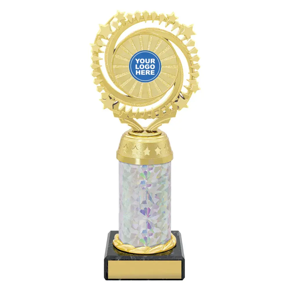 Cosmic series of affordable trophies feature star spangled holder in gold or silver - choose colour of column to suit your order. Suit 25 or 50mm centre insert.