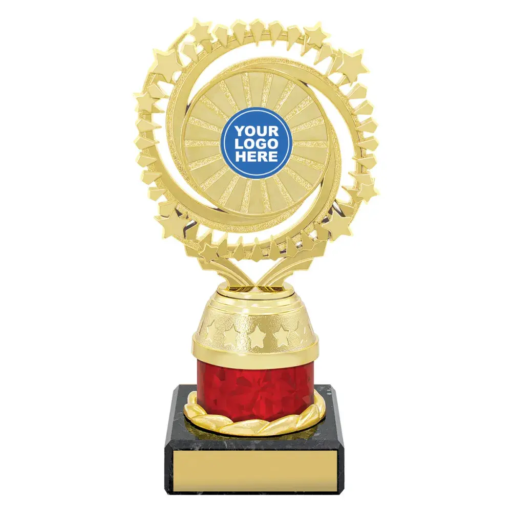 Cosmic series of affordable trophies feature star spangled holder in gold or silver - choose colour of column to suit your order. Suit 25 or 50mm centre insert.