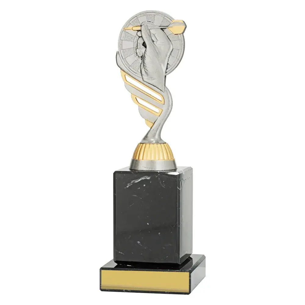 Classic darts theme finished in antique trophy silver on premium black marble over multiple sizes.