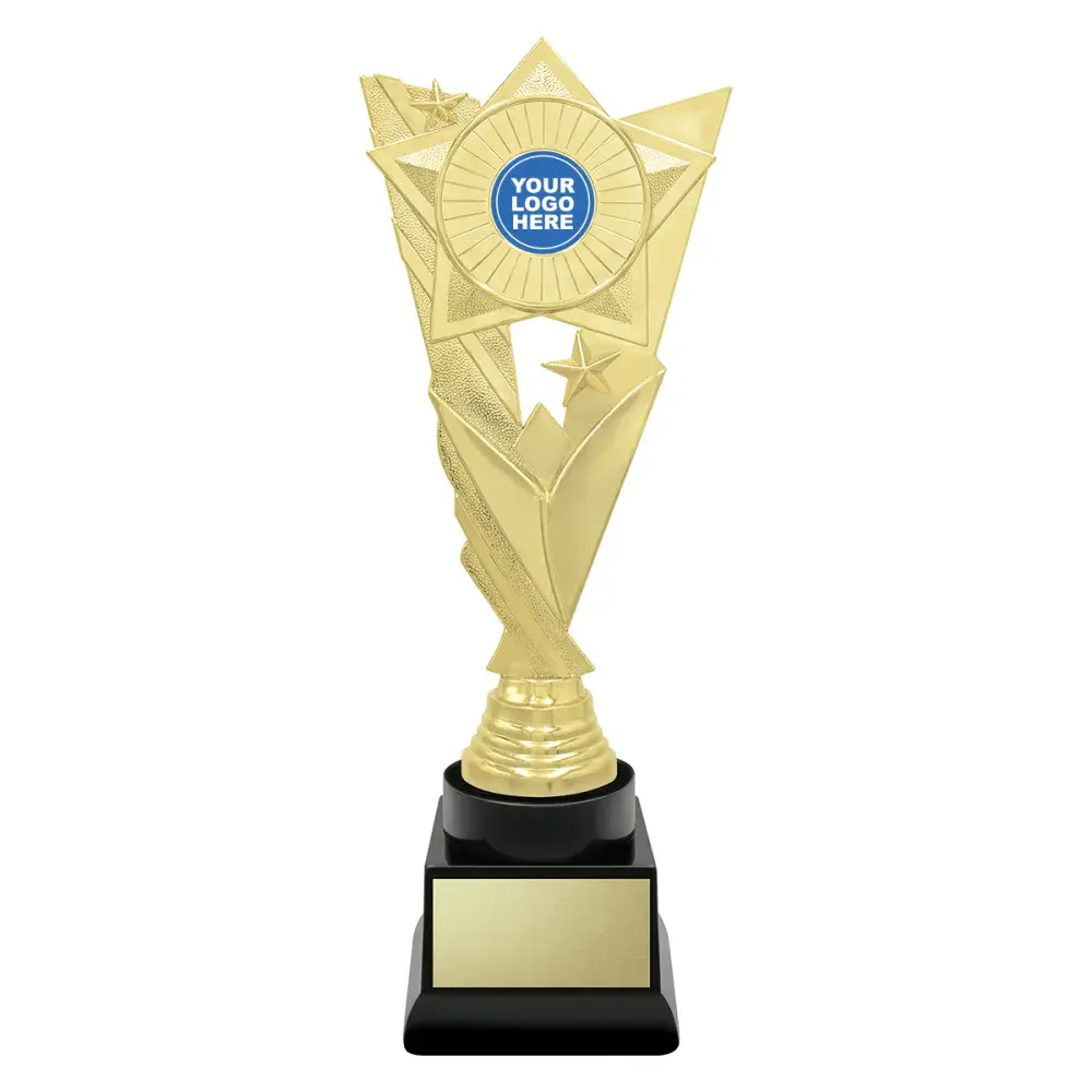 Star inspired trophies showcase your custom logo over a number of sizes. Trophy series finished in bright gold and offer great value for your event or competition.
