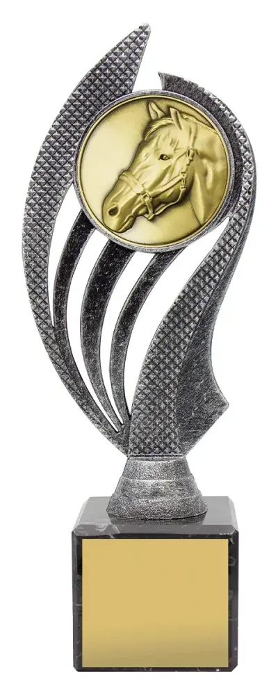 Husky series of trophies on premium black marble allows for different award options for your activity. Appealing antique silver and gold combination over number of sizes.