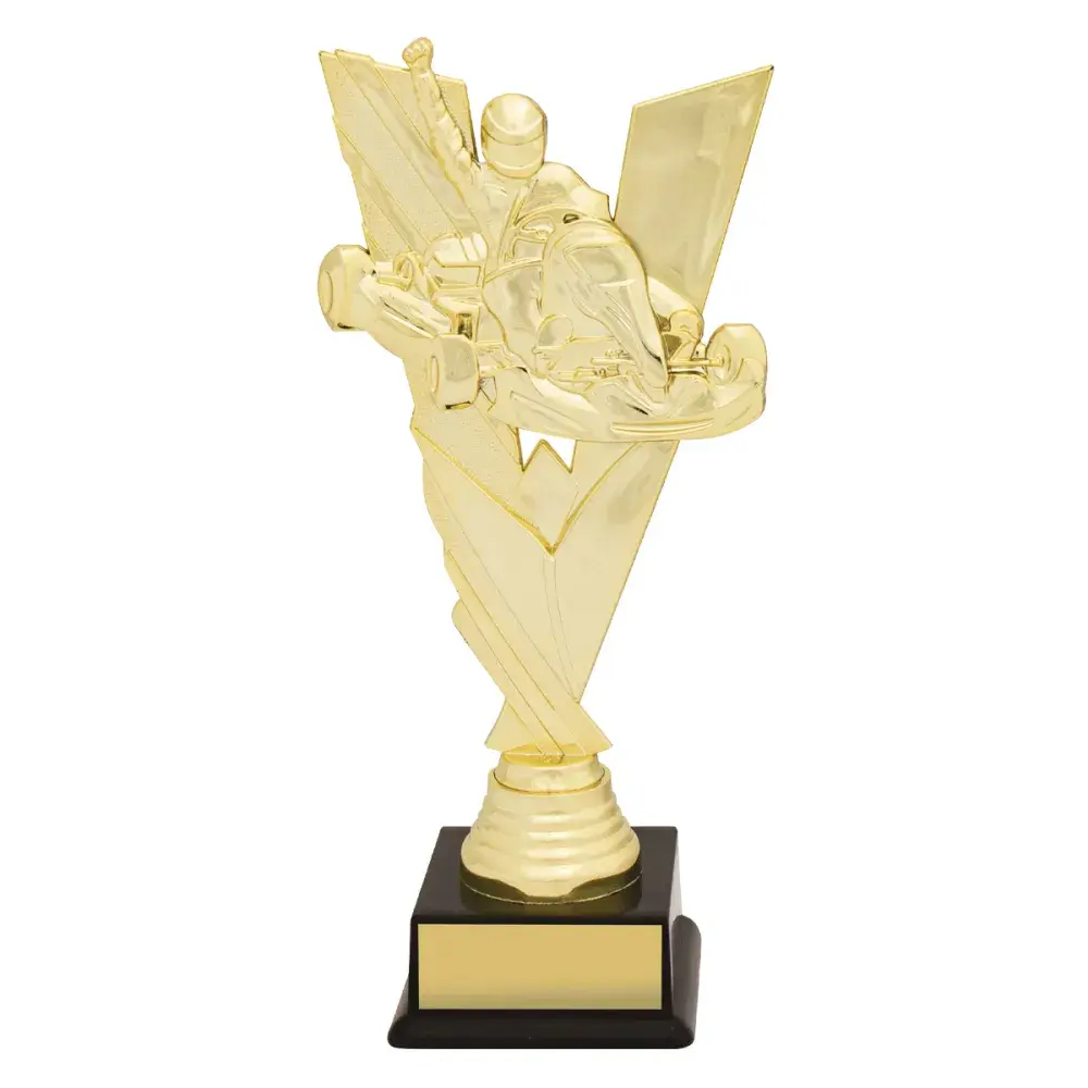 Impressive trophies feature bold top for karting with excellent detail and finished in traditional trophy gold.