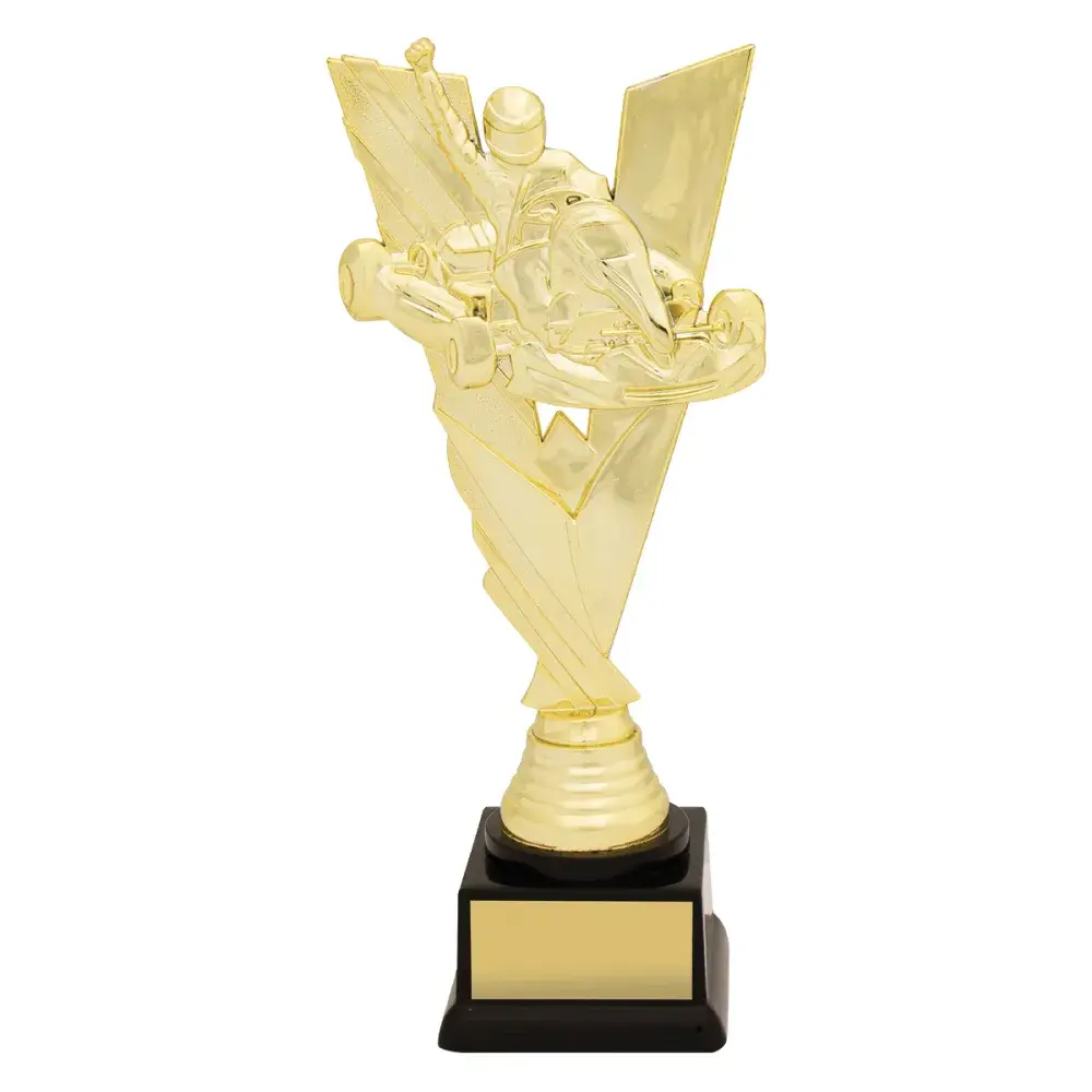 Impressive trophies feature bold top for karting with excellent detail and finished in traditional trophy gold.