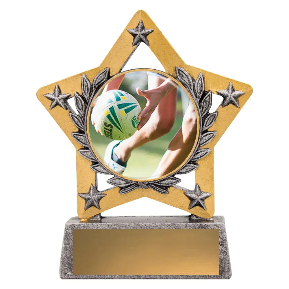 Star inspired design with traditional gold and silver colours - showcase brilliant colour image for your sport or activity. Mini stars offer great value.