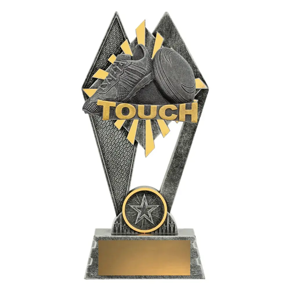 The Peak Series is an innovative trophy series offering super value for such an impressive size range. An elevated design that showcases the elements of Touch football against a vibrant sunray background.