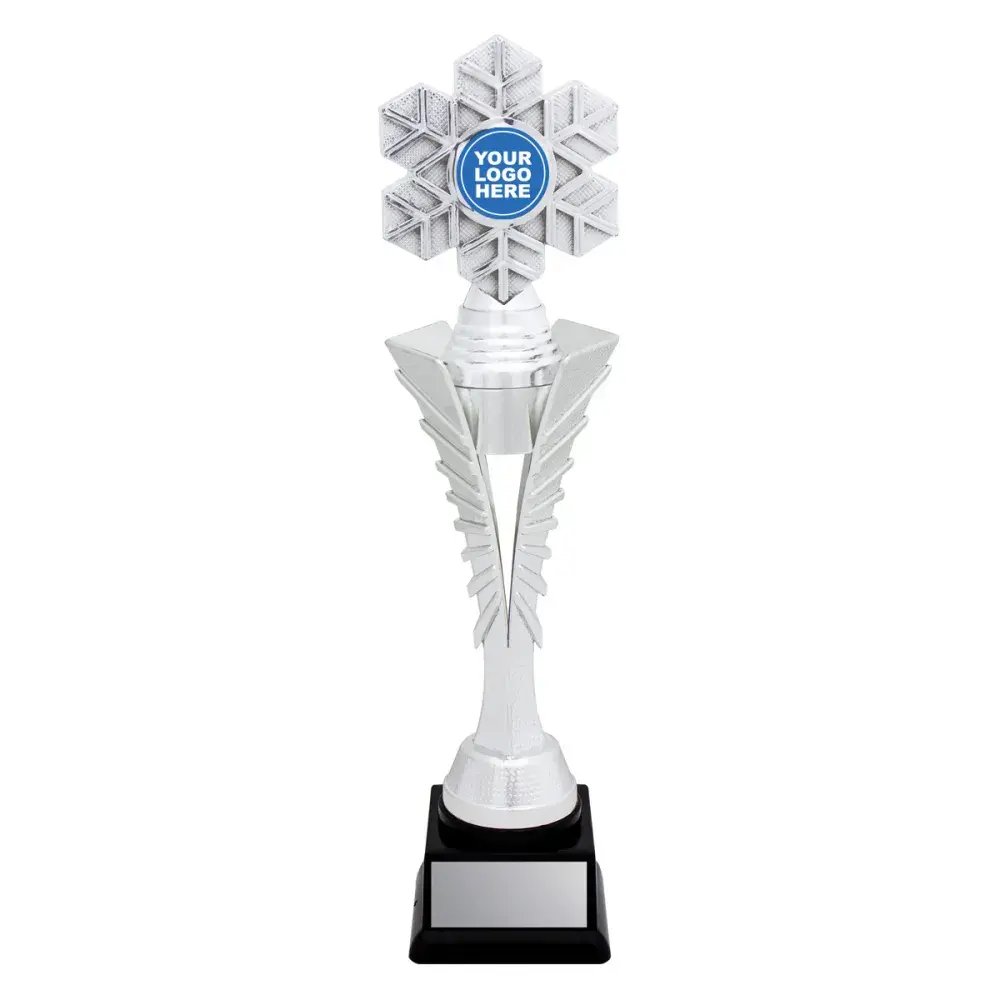 Dazzling series of silver coloured trophies feature appealing 'snowfall' top. Possibly well suited to your snow & winter based event. Suits insert if required.