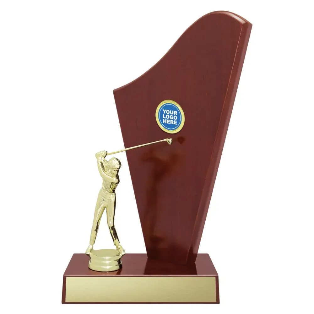 Different wave inspired trophies feature distinctive walnut timber and bright gold top for golf. Choose top or figure for your sport.