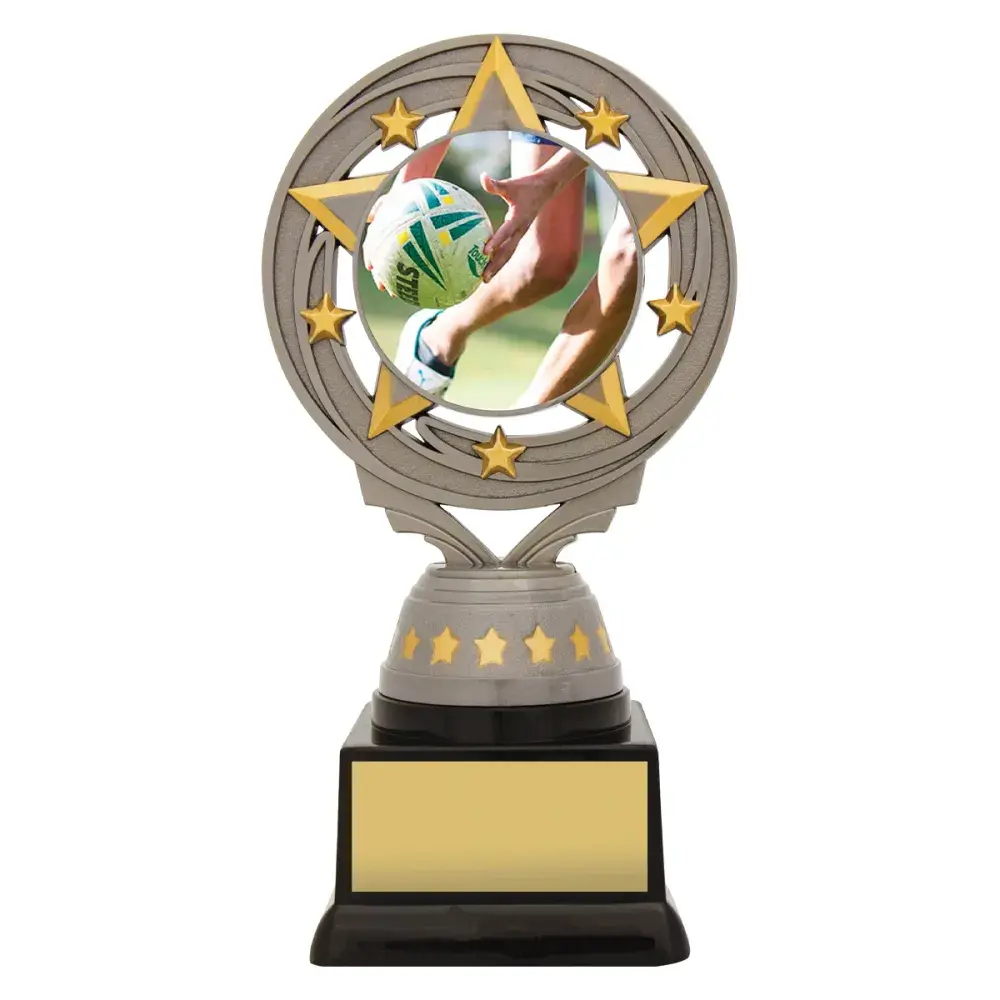Affordable range of holder style trophies in gold & silver suit 25 or 50mm insert. Add insert from range available or ask about custom logo or design.