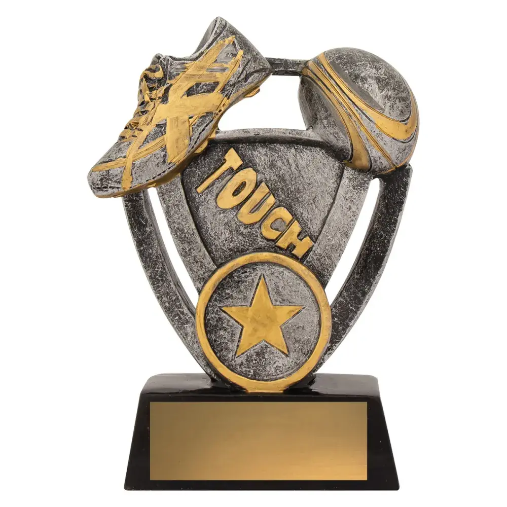 Touch football budget trophy series in 3 sizes, antique silver and gold, a reliable choice for your participation awards. Design features space for customisation.