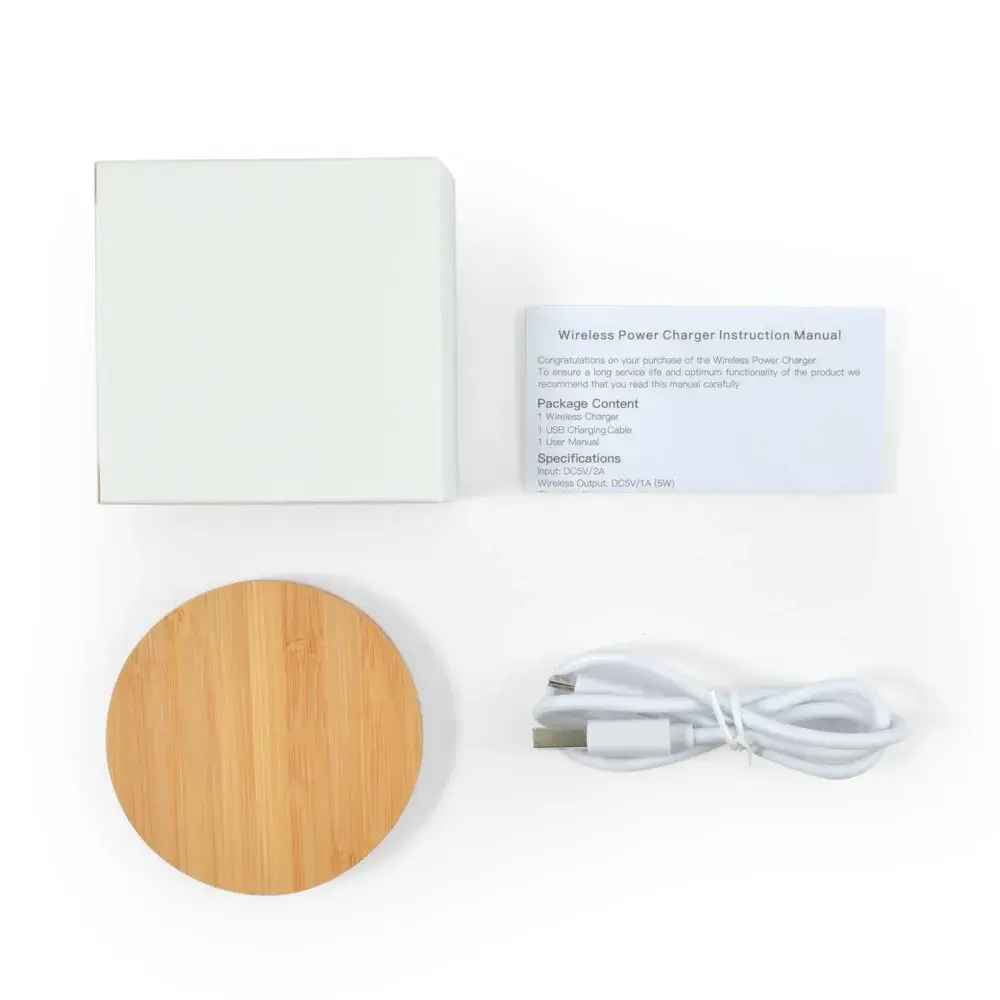 Inductive wireless charge pad compatible with phones that offer wireless charging. Made from Bamboo. Connect charging pad to power using micro USB cable provided then place your phone on the charging pad to charge. Instructions included. Includes inductive charging indicator. Eco Credentials: Renewable, sustainable, printed using renewable energy.