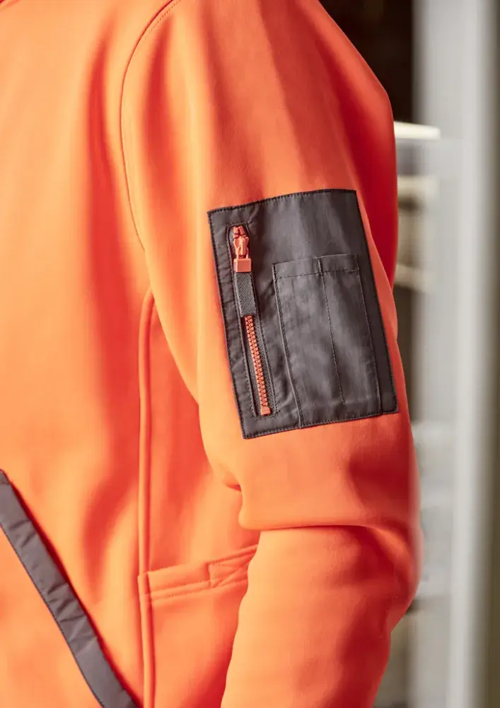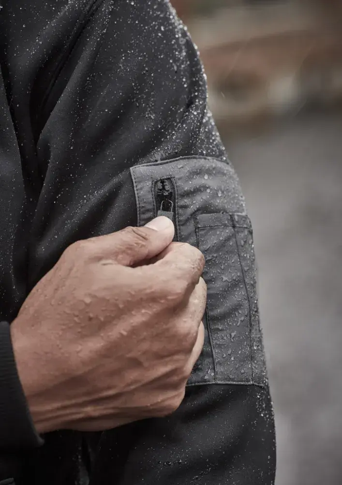 Contrast arm pocket with zip closure.