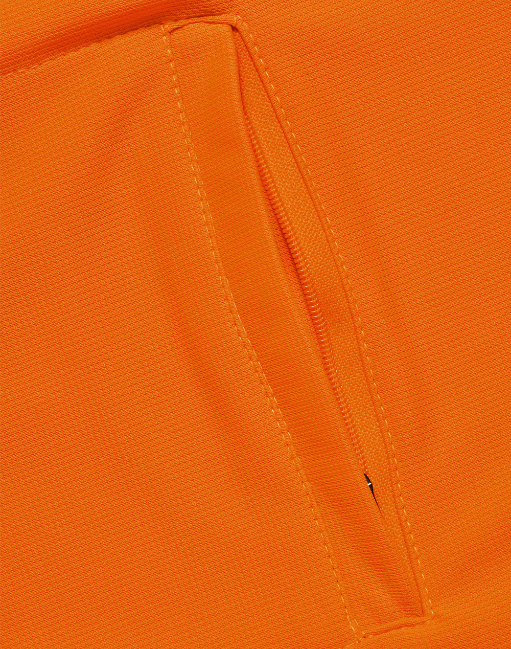 Unisex mini waffle trim fluoro polo with contrast panels, cool vent across back shoulder yoke, reflective piping and sleeve V sashes, zip pocket and striped collar.