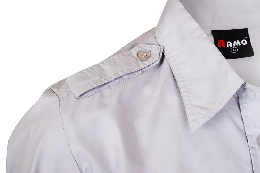 100% cotton Military styled shirts removable epaulettes on shoulder buttoned flaps to support rolled up sleeves enzyme washed Long sleeve